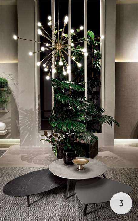Per l’illuminazione il Lampadario Swing Iron (1) dal look orientale, ha all’interno della struttura in metallo laccato, un paralume nero che filtra la luce in modo piacevole e rilassante. Mentre i tavolini Daisy di Colombini (3) sapranno creare la giusta atmosfera con un originale senso della comodità e dello stile.