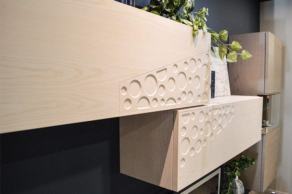 I decori incavati a forma di luna nel legno massello arricchiscono la collezione Moon: un design inconfondibile per questa parete.